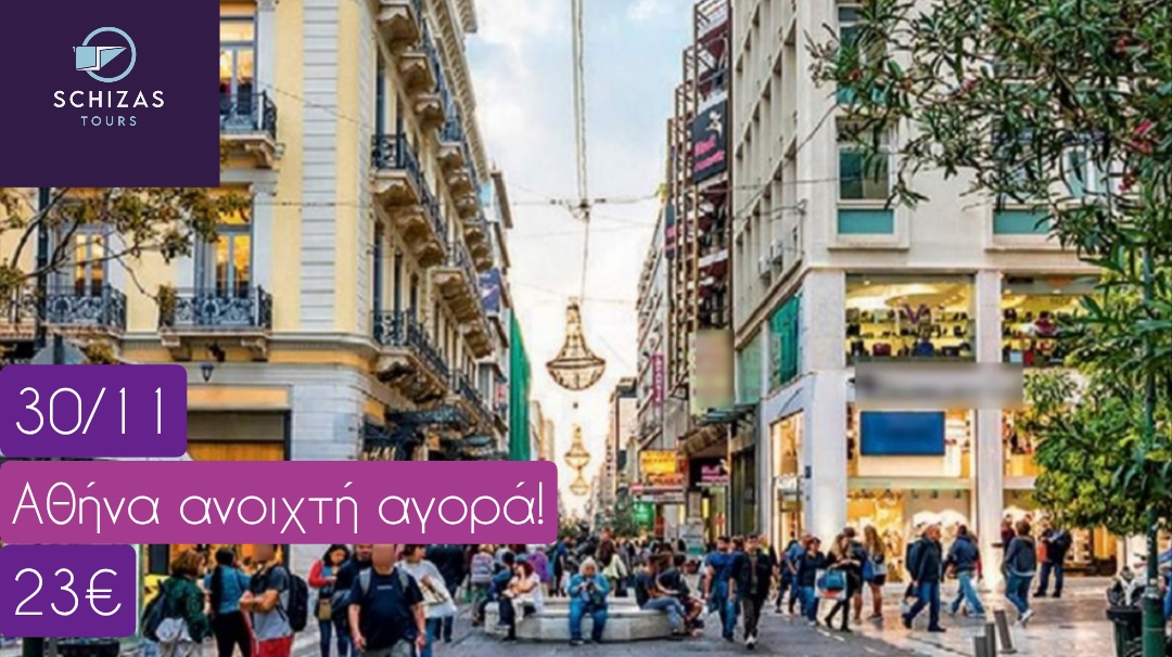 | Αναχώρηση στις 07.00 από Πάτρα και στις 07.45 από Αίγιο για την Αθήνα με ενδιάμεση στάση για καφέ. Άφιξη στο κέντρο της πρωτεύουσας και ελεύθερος χρόνος για βόλτα και ψώνια στην στολισμένη Αθήνα. Στις 17.00 συγκέντρωση και για επιστροφή στις πόλεις μας με ενδιάμεση στάση.
