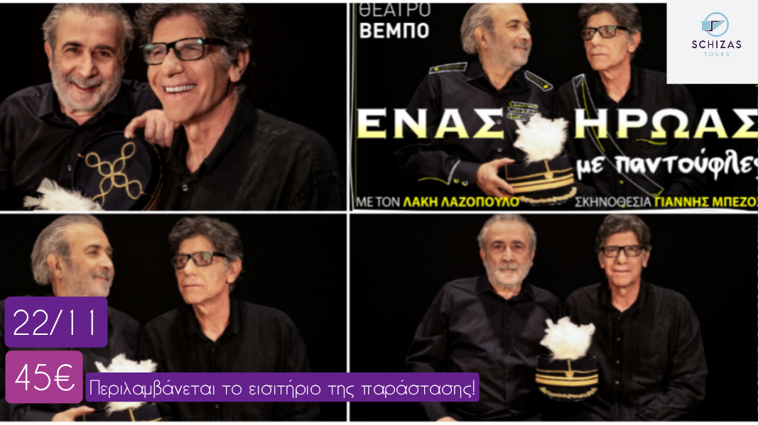 Υπό τη σκηνοθετική ματιά του Γιάννη Μπέζου, πρώτου διδάξαντα των κωμικών της γενιάς του, ο Λάκης Λαζόπουλος θα φορέσει της παντούφλες του και θα εξορμήσει ηρωικά στη σκηνή του θεάτρου Βέμπο. Το «Ένας ήρωας με παντούφλες» γράφτηκε από τους Αλέκο Σακελλάριο και Χρήστο Γιαννακόπουλο το 1947, στη διάρκεια του εμφυλίου πολέμου. Αποτελεί μια γενναία απόπειρα των συγγραφέων να αναδείξουν την ευγενική πλευρά της πατρίδας, που κρύβεται μέσα στο σκοτάδι της εποχής. ΩΡΑ ΑΝΑΧΩΡΗΣΗΣ : 16.00(ΠΑΤΡΑ) & 16.45 (ΑΙΓΙΟ) ΕΝΑΡΞΗ ΠΑΡΑΣΤΑΣΗΣ : 20.30 ΧΩΡΟΣ: ΘΕΑΤΡΟ ΒΕΜΠΟ Τιμή κατ΄ άτομο : 45€ ΣΤΗ ΤΙΜΗ ΠΕΡΙΛΑΜΒΑΝΟΝΤΑΙ: